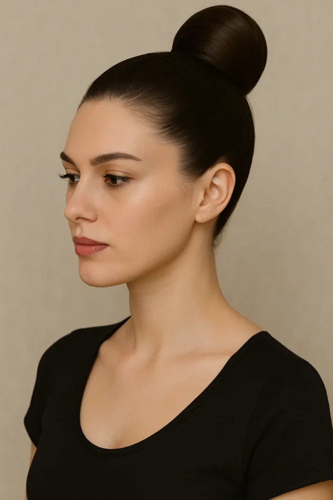 A polished top bun that pulls hair tightly upward for a clean, sophisticated appearance. Perfect for professional events or glamorous evenings.